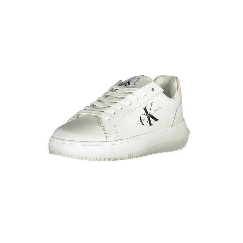 Stride in style with these CALVIN KLEIN sneakers, showcasing a contemporary edge perfect for the urban fashionista. Intricate detailing meets a classic sporty aesthetic in this stark white pair, crafted with a commitment to sustainability. Featuring a bold logo and an eye-catching design, these shoes are a statement of modern luxury and environmental awareness.